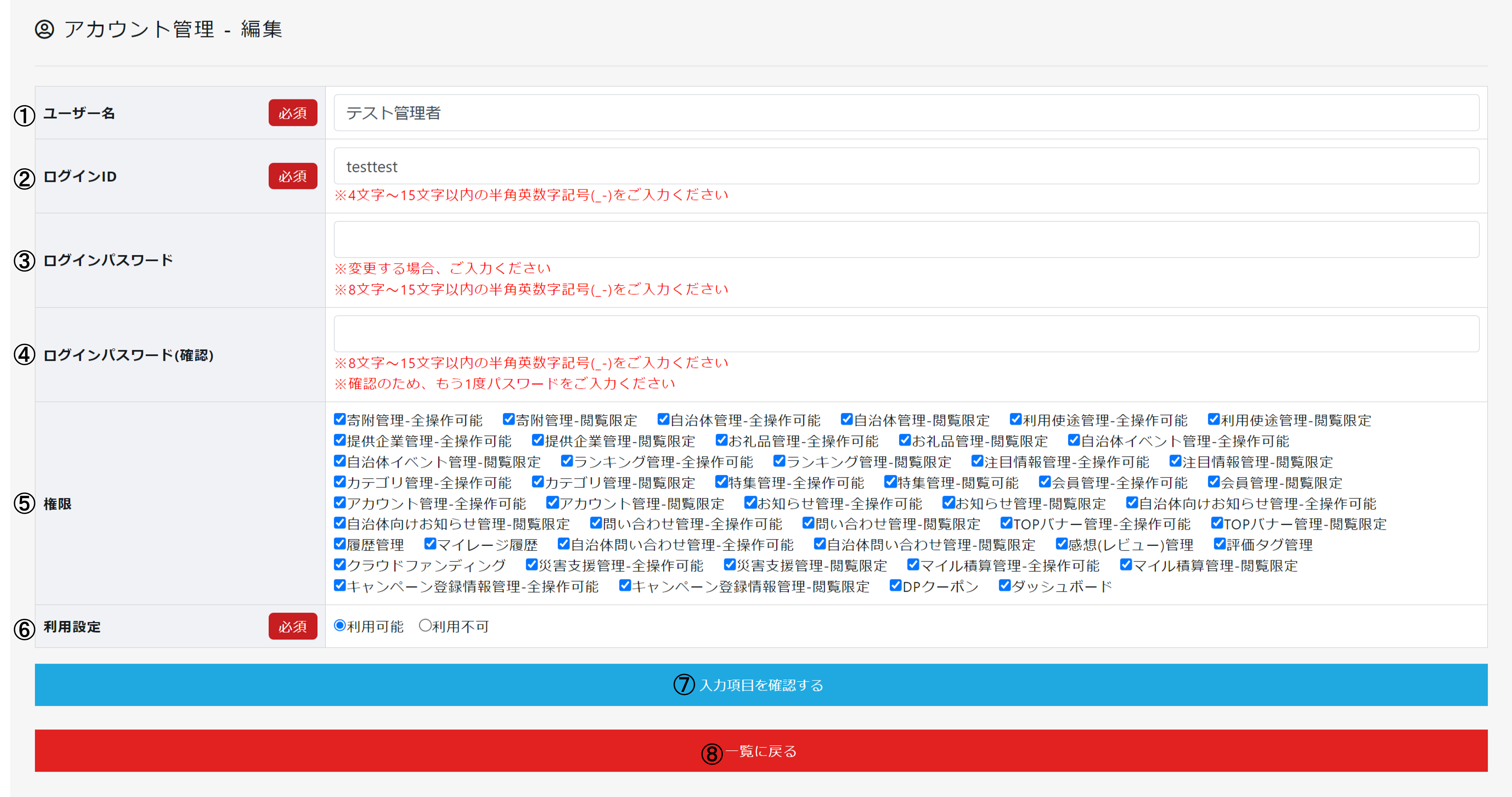 | ⑧ | 一覧に戻る | 返礼品管理一覧に戻ります。 |