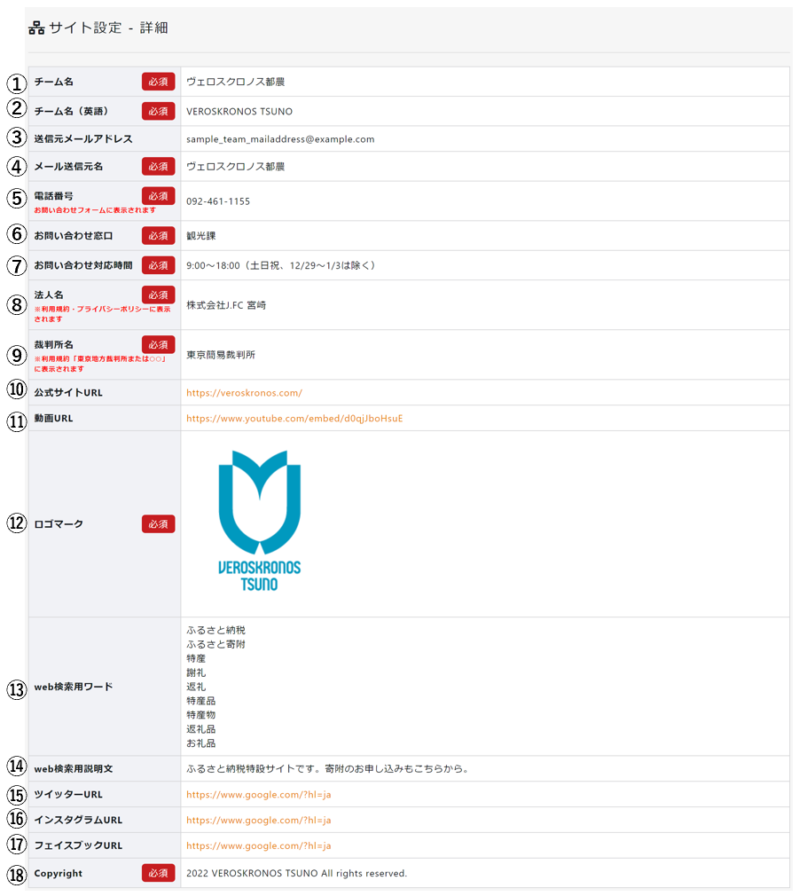 | ⑰ | フェイスブックURL | チームのフェイスブックURLを入力します。 |