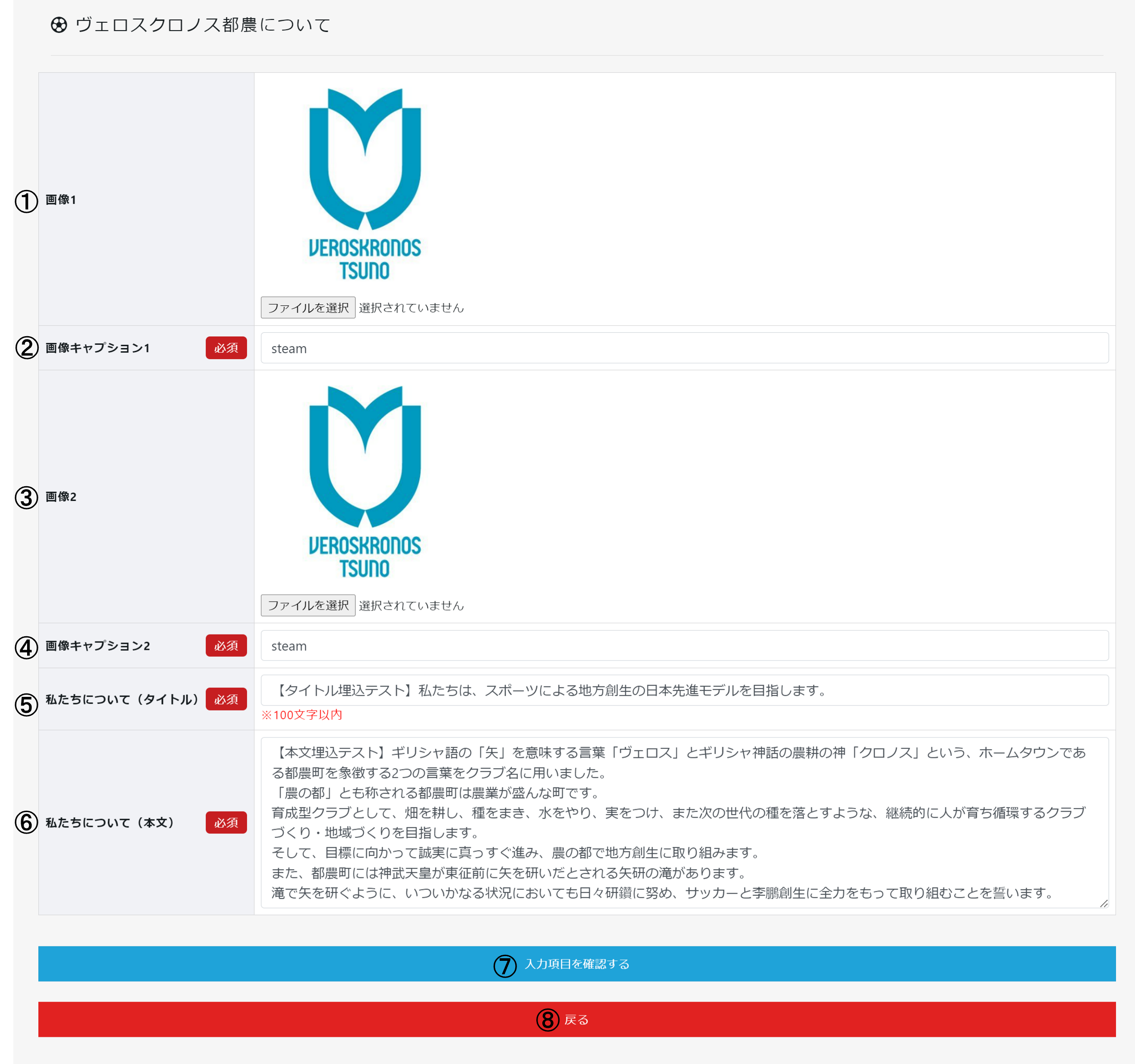 | ① | 画像1 | チームについての画像1をアップロードします。 |