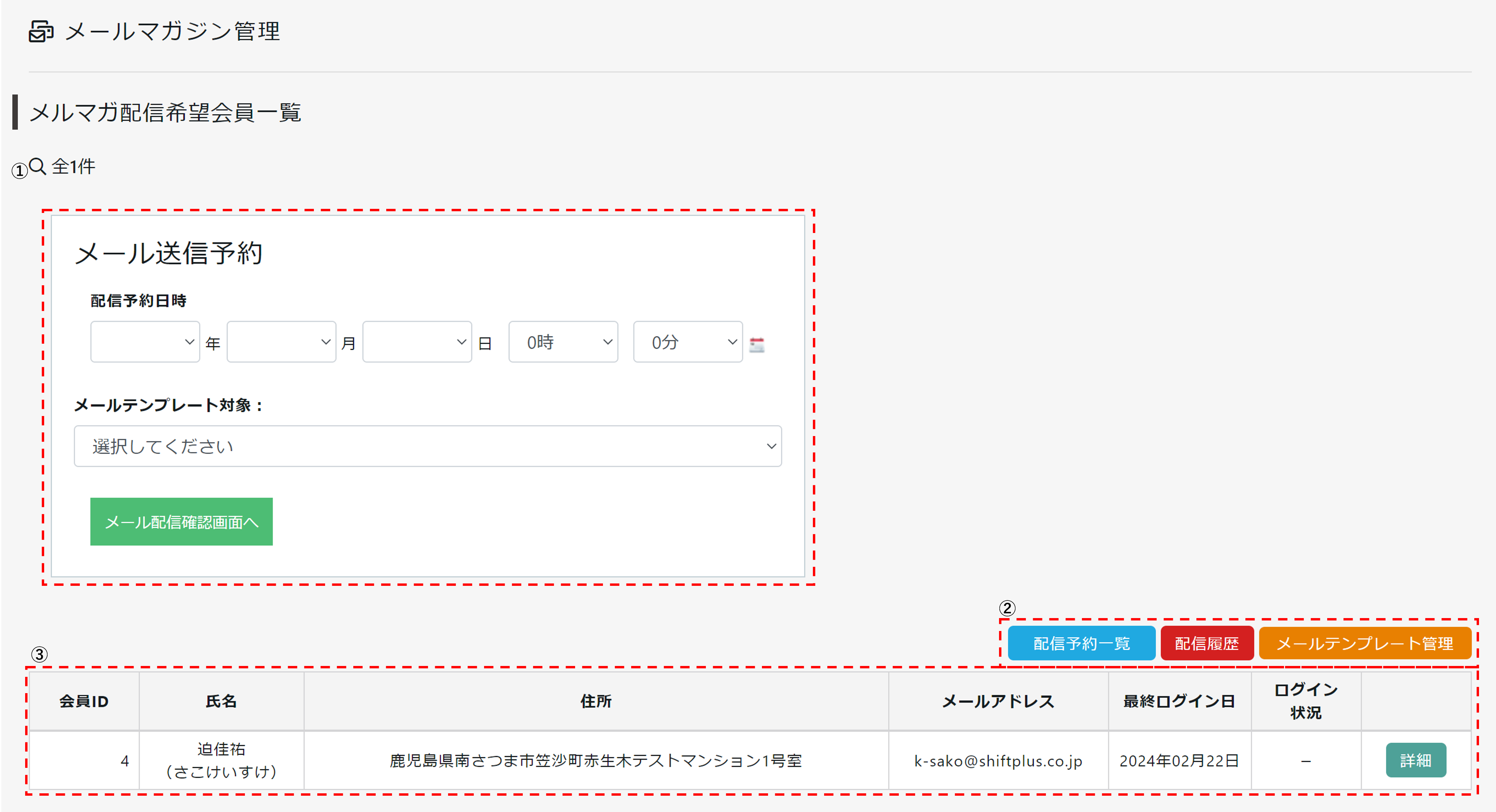 | ② | 配信予約一覧:メール配信の予約一覧を確認することができます。 配信履歴:メール配信の履歴を確認することができます。 メールテンプレート管理:メールテンプレートの作成・編集等をすることができます。 |