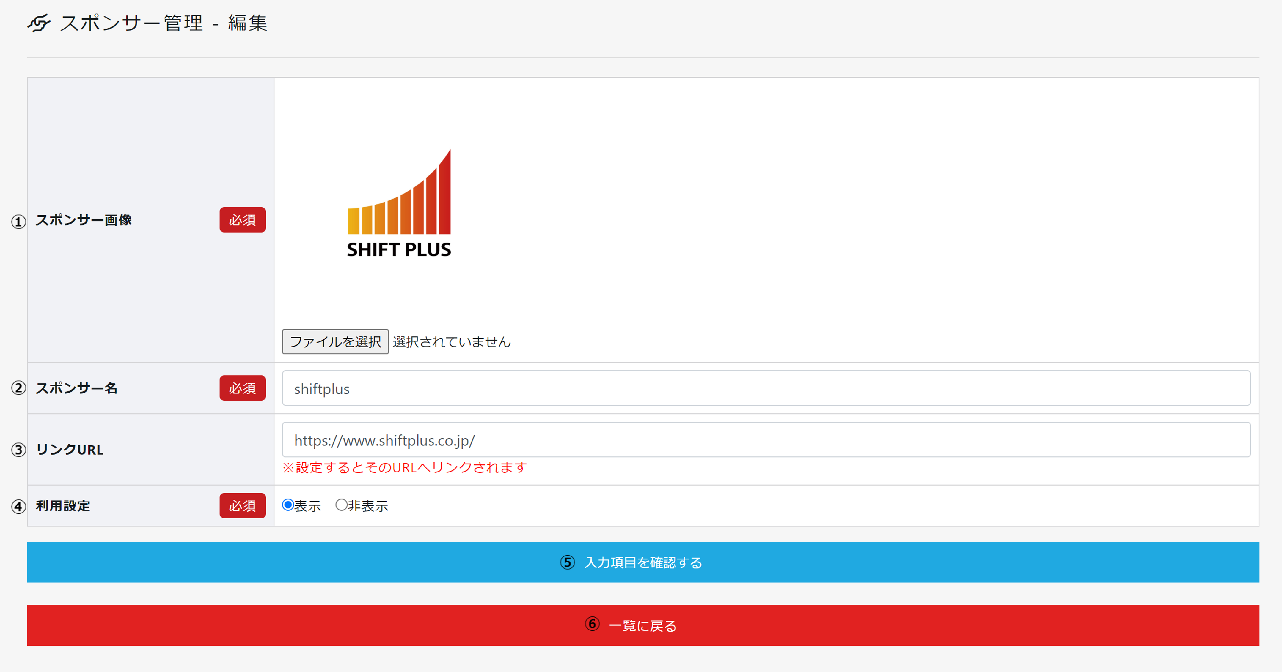 | ⑥ | 一覧に戻る | スポンサー管理の一覧へ移動します。 |