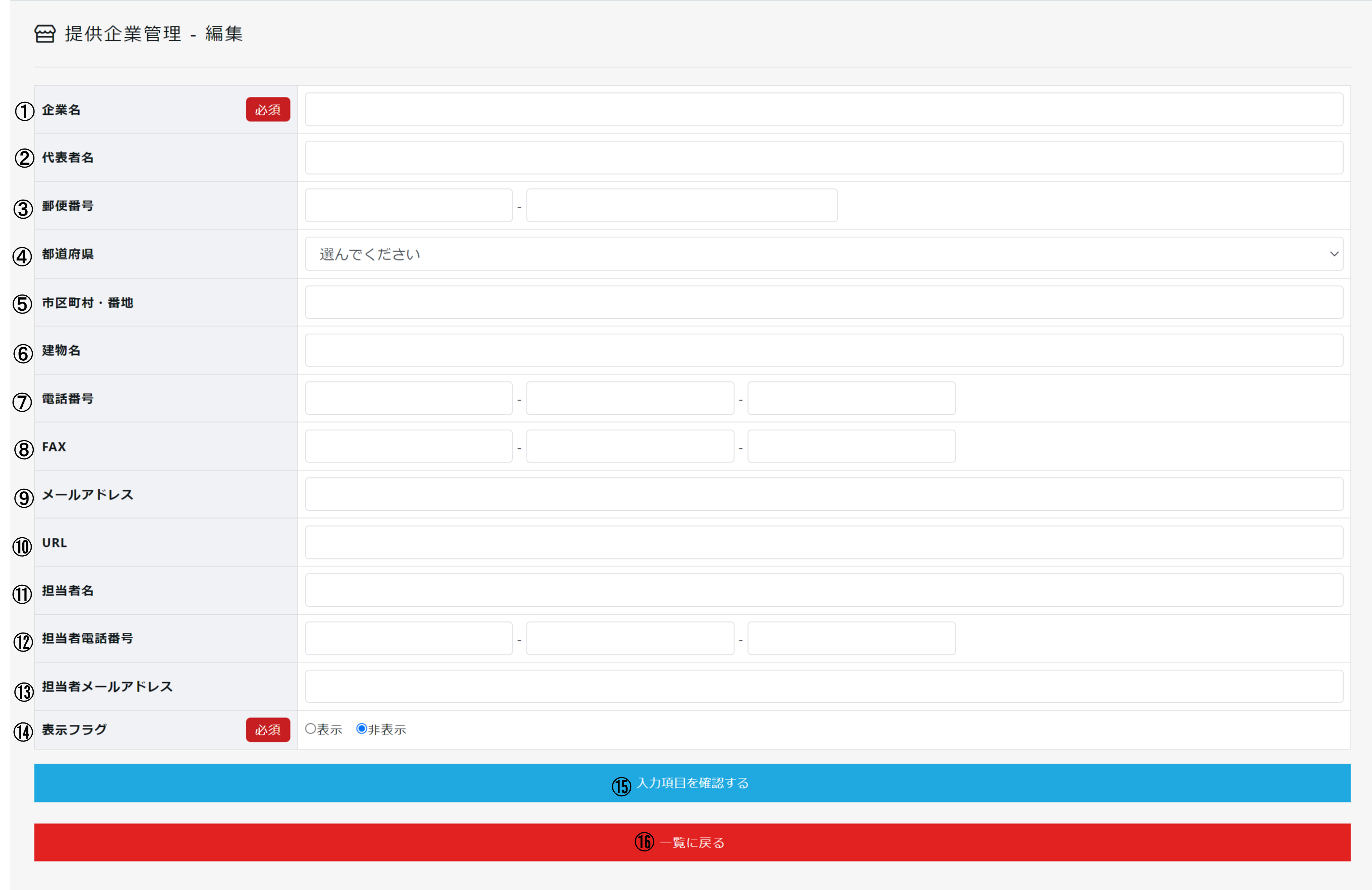 | ⑯ | 一覧に戻る | 提供企業管理一覧に戻ります。 |
