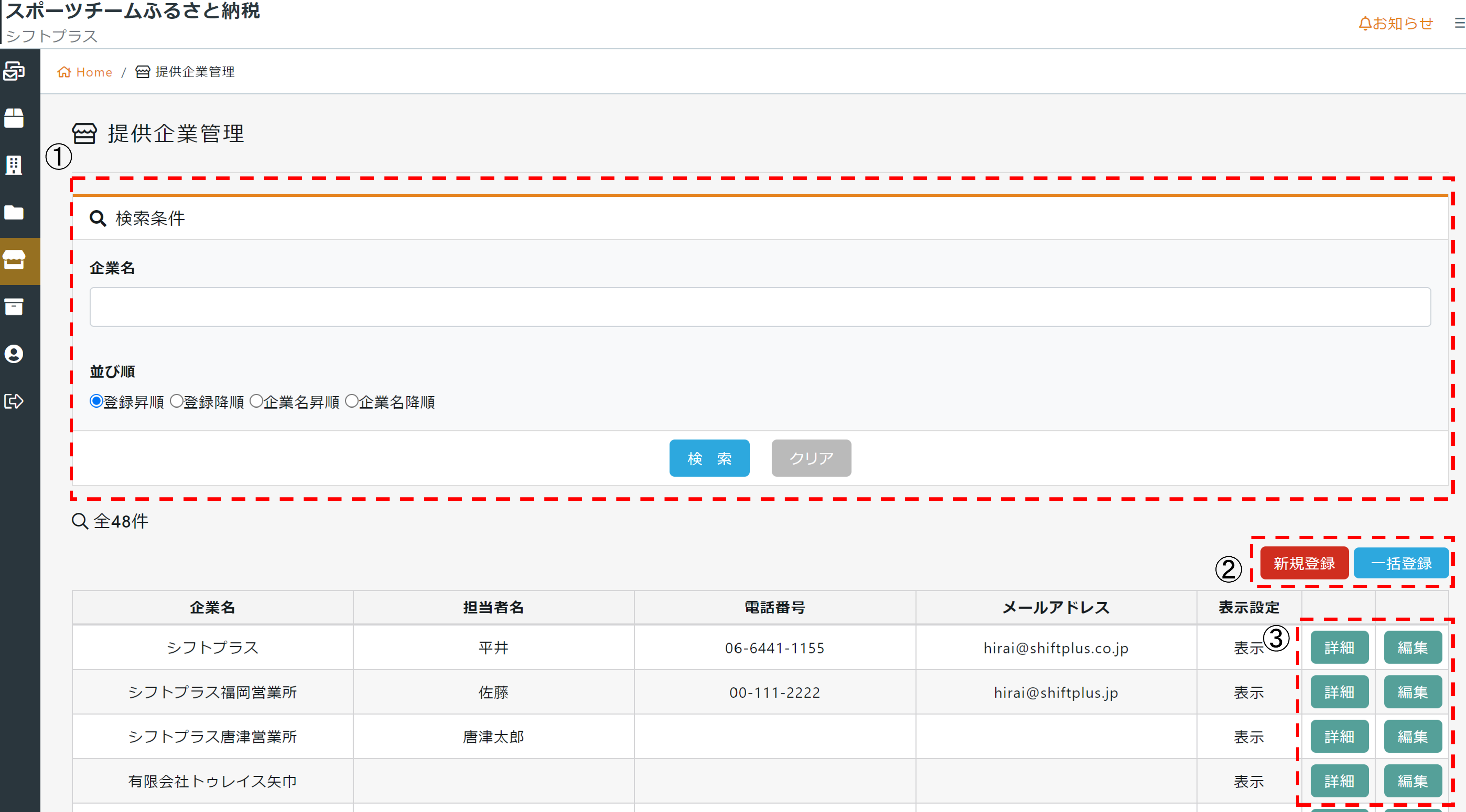 | ② | 新規登録:新規事業者の登録が行えます。 一括登録:CSV取り込みによって情報を一括で編集が行えます。 |