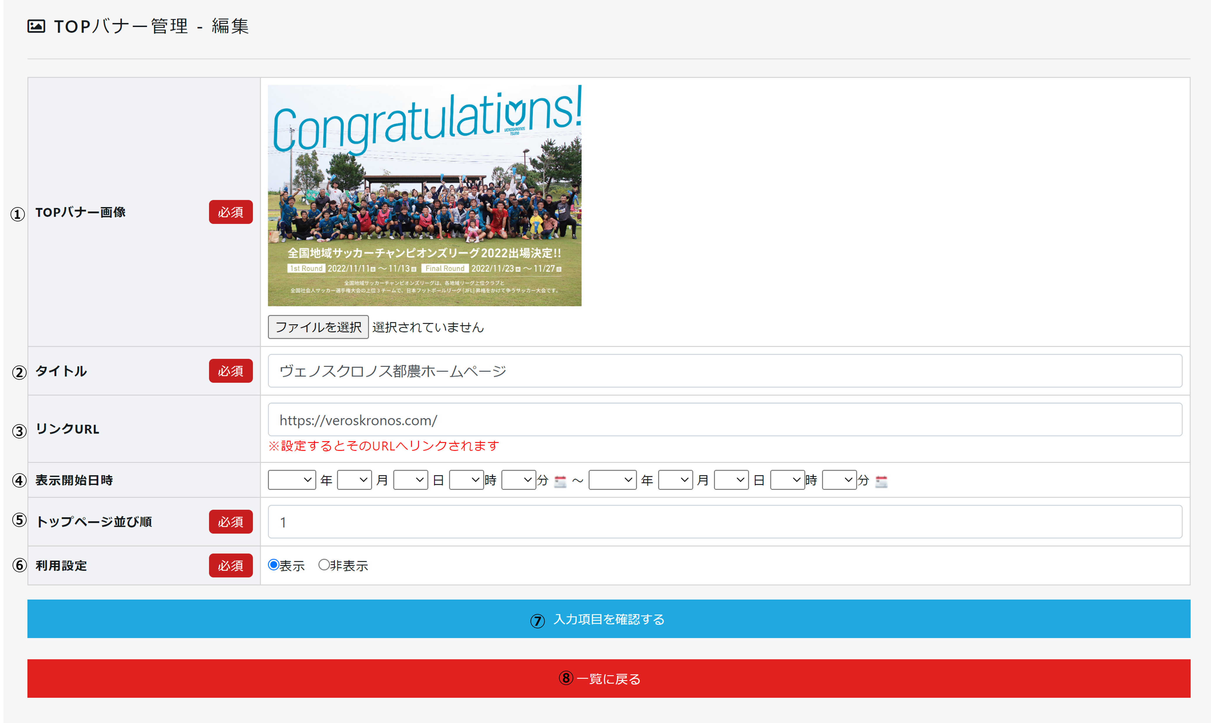 | ⑧ | 一覧に戻る | TOPバナー管理の一覧へ移動します。 |